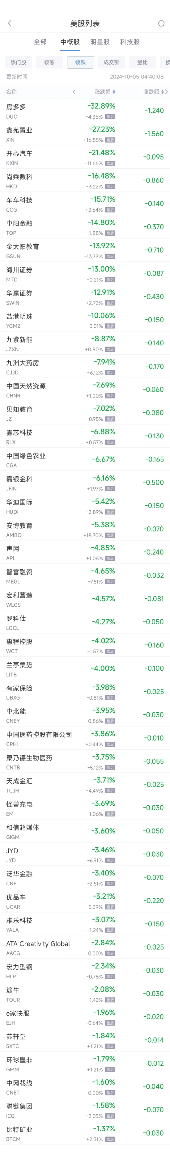 领跌中概股列表: