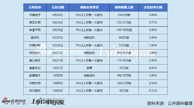 从减持比例看,华康医疗、漱玉平民、共同药业、振德医疗减持比例最高,均为3%;华熙生物减持比例为2.5%,排名第五;溢多利、康众医疗减持比例为2%;科美诊断减持比例为1.8%,其余各股减持比例均小于1%。其中,共同药业、振德医疗、溢多利减持方为控股股东。
