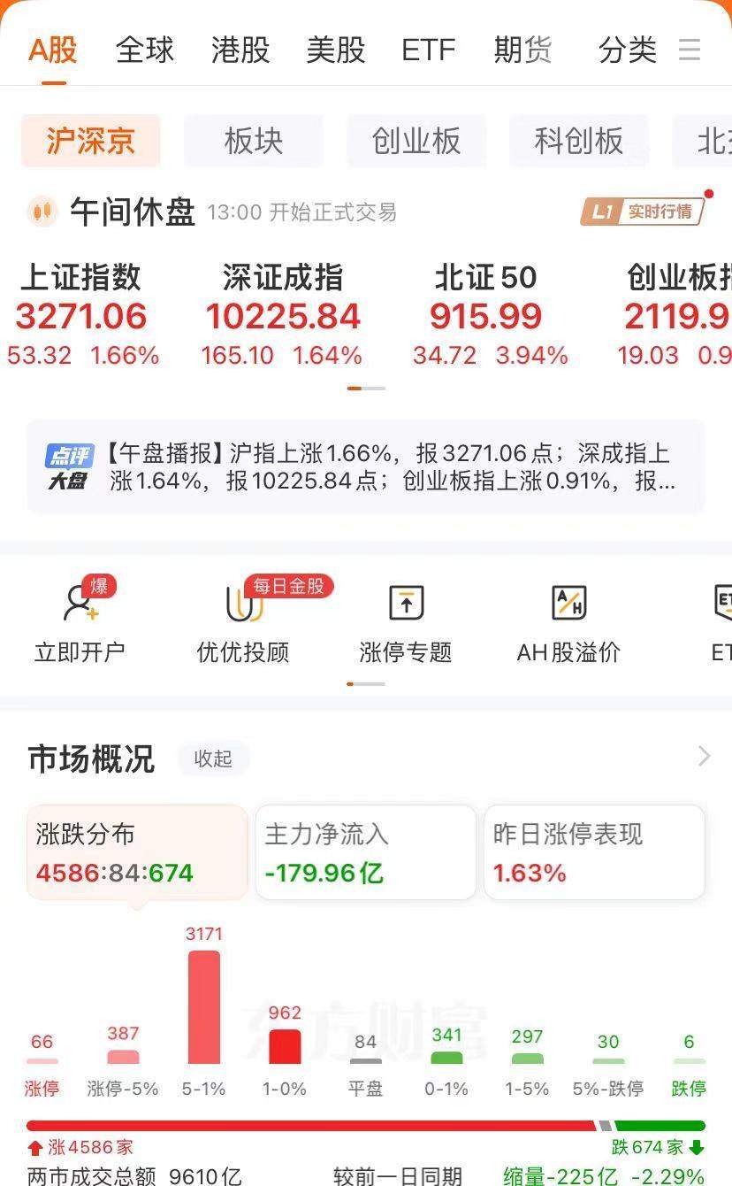 10月14日上午,市场早盘探底回升,上演深V走势,沪指领涨。截至收盘,沪指涨1.66%,深成指涨1.64%,创业板指涨0.91%。总体上个股涨多跌少,全市场超4500只个股上涨。沪深两市半日成交额9610亿元,较上个交易日缩量226亿元。