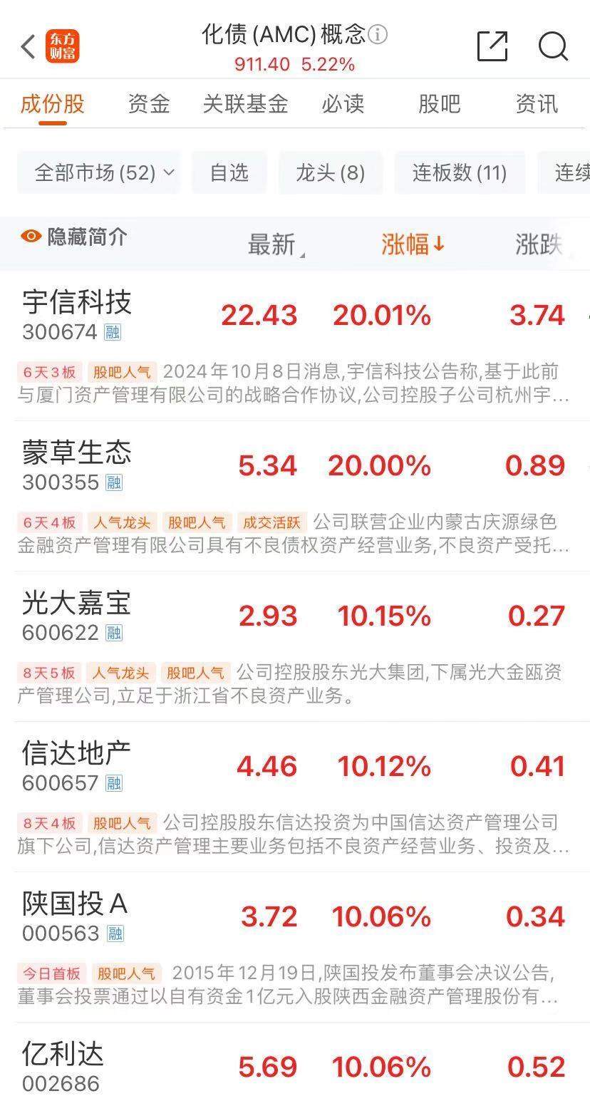 盘面上,化债概念股开盘大涨,光大嘉宝(600622)、信达地产(600657)、陕国投A、银宝山新(002786)等多股涨停。