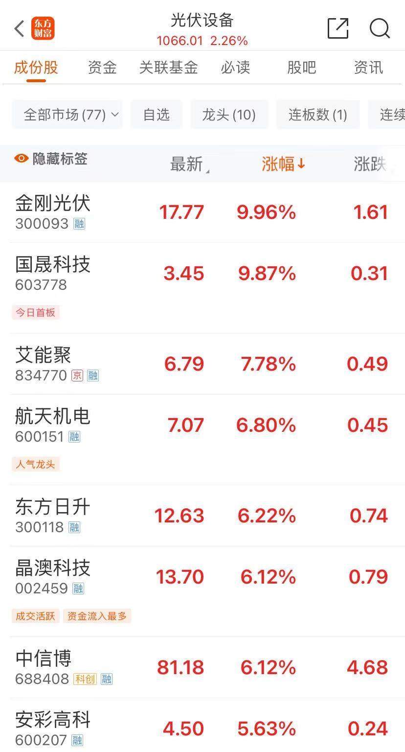 上午,光伏板块异动拉升,金刚光伏涨超10%,东方日升(300118)、晶澳科技、安彩高科(600207)、宇邦新材、中来股份(300393)、阿特斯等跟涨。