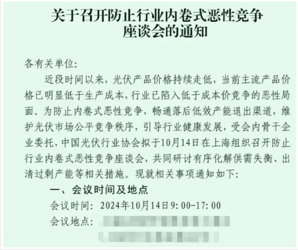 据上海证券报14日消息,记者从业内拿到的一份《关于召开防止行业内卷式恶性竞争座谈会的通知》(下称《通知》)显示,光伏行业协会于今天(10月14日)9点在沪召开防止行业内卷式恶性竞争座谈会,主题仍是化解出清过剩产能。