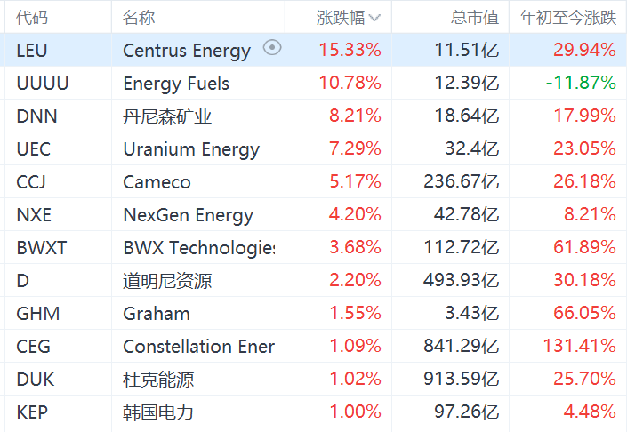 美股市场核电股集体走强,其中,Centrus Energy涨超15%,Energy Fuels涨超10%,丹尼森矿业涨超8%,Uranium Energy涨超7%,Cameco涨超5%,NexGen Energy涨超4%,BWX Technologies涨超3%,道明尼资源涨超2%。