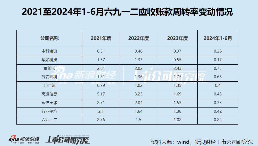 一般而言,应收账款占营业收入的比例越高,说明公司对下游公司的议价能力越弱,应收账款可收回性越差。不仅如此,六九一二应收账款周转率也一直在下降,并且低于绝大部多数同行业可比公司。