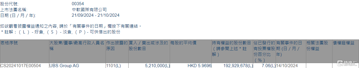 格隆汇10月21日丨根据联交所最新权益披露资料显示,2024年10月14日,中国软件国际(00354.HK)获UBS Group AG在场内以每股均价5.9696港元增持521万股,涉资约3110.2万港元。