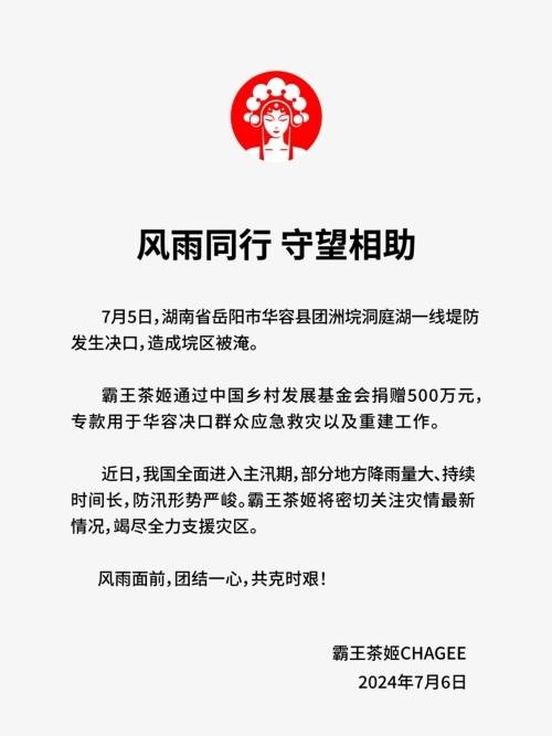 次日,新茶饮品牌霸王茶姬发布公告称,已通过中国乡村发展基金会捐赠500万元,专款用于华容决口群众应急救灾以及重建工作。霸王茶姬同时表示,将密切关注灾情最新情况,竭尽全力支援灾区。
