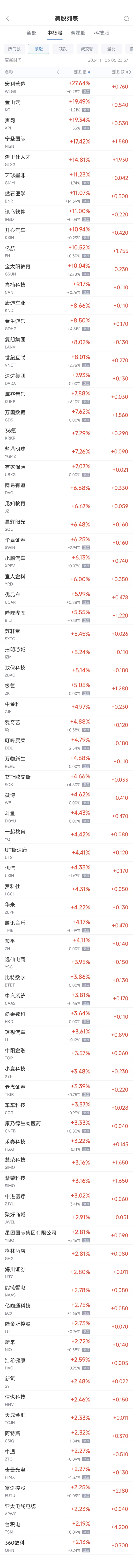 上涨股当中(按市值降序排列),台积电涨2.19%,阿里巴巴涨0.85%,京东涨0.43%,网易涨1.44%,携程涨1.75%,百度涨1.57%,中华电信涨1.08%,理想汽车涨3.61%,贝壳涨1.94%,百济神州涨0.38%,日月光半导体涨0.73%,腾讯音乐涨4.17%,中通涨2.27%,富途控股涨2.25%,小鹏汽车涨6.13%,华住酒店集团涨1.22%,蔚来涨2.72%,哔哩哔哩涨5.55%,满帮涨0.78%,WSP控股涨0.50%,极氪涨5.05%,BOSS直聘涨1.90%。