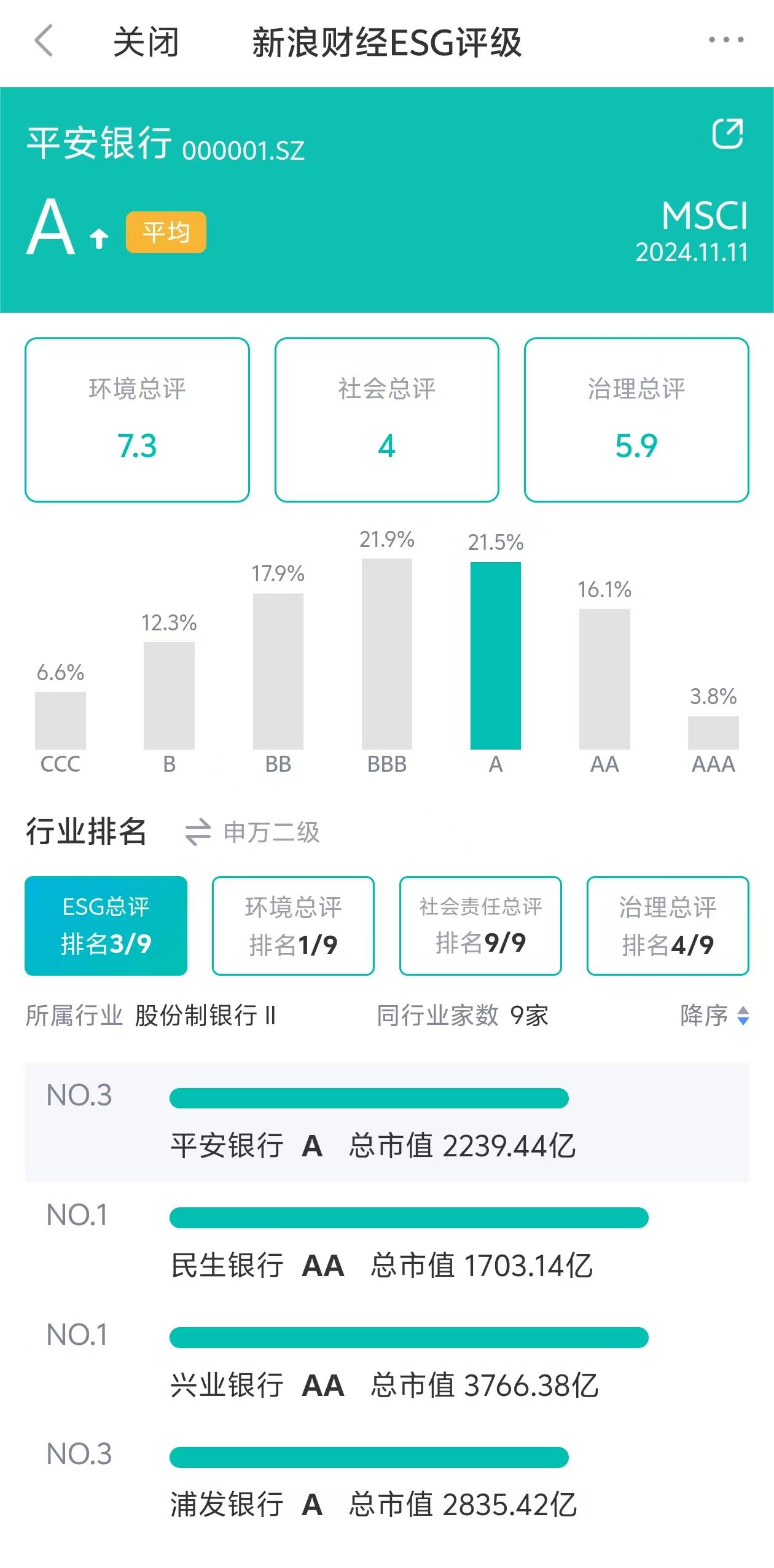 最新MSCI ESG评级报告显示,平安银行在融资活动环境影响、普惠金融、隐私与数据安全、公司治理等核心领域表现突出,均处于行业领先水平。此次ESG评级提升至A级,不仅是对平安银行在ESG领域长期努力和成果的认可,也反映了国际资本市场对其在ESG管理方面取得的显著进展和持续努力的高度评价。