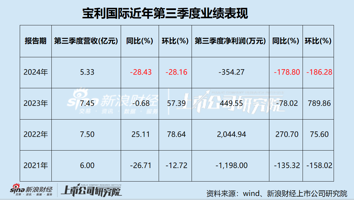 2022年、2023年,宝利国际第三季度业绩表现显著优于第二季度,但今年却反其道而行之,经营业绩十分惨淡。Q3,公司实现营业收入5.33亿元,同比下降28.43%,环比下降28.16%;净亏损186.28万元,同比下降178.8%,环比下降186.28%。