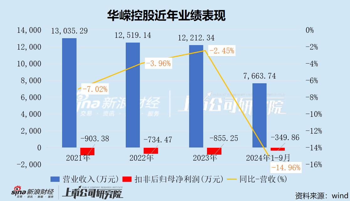 今年前三季度,华嵘控股经营业绩仍没有改善的迹象,营业收入7663.74万元,同比下降14.96%;扣非后归母净亏损349.86万元,同比减亏4.24%。