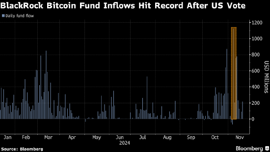 与此同时,贝莱德440亿美元iShares比特币信托的首批期权押注表明,交易员认为该代币还有打破更多纪录的空间。