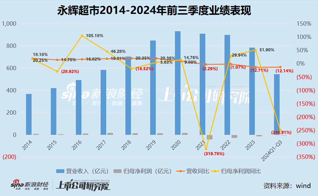 与此同时,上市多年来始终保持盈利的永辉超市也在2021年开始由盈转亏。2021-2024年前三季度,永辉超市分别亏损39.44亿元、27.63亿元、13.29亿元、0.78亿元,其中仅2024年前三季度亏损规模相对较小,但相比于2023年前三季度的盈利0.52亿元,依然同比-248.91%。