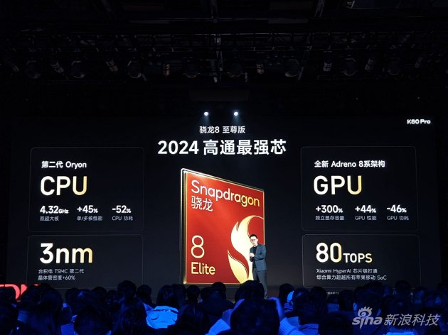 性能方面,K80 Pro搭载高通骁龙8至尊版移动平台。该芯片采用台积电第二代3nm工艺制程,CPU该用高通自研Oryon架构,2个超大核+6个大核,双超大核频率高达4.32GHz。对比上代,单核悉能提升45%,多核超越苹果A18 Pro。GPU采用Adreno 830架构,对比上代提升44%,AI性能提升105%。性能提升同时,CPU功耗最高降低52%,GPU功耗最高降低46%,AI能效提升45%。