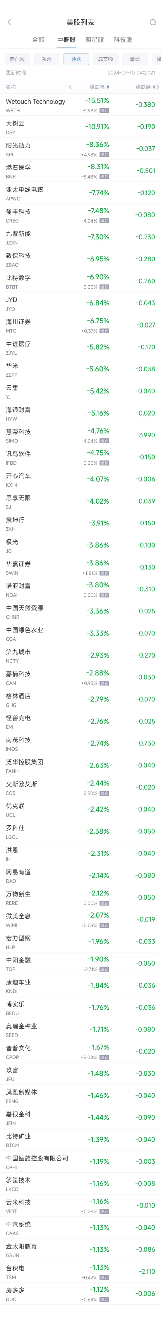 上涨股当中(按市值降序排列),拼多多涨2.26%,阿里巴巴涨2.99%,网易涨1.95%,京东涨1.32%,携程涨2.72%,百度涨8.47%,日月光半导体涨1.61%,腾讯音乐涨5.24%,贝壳涨2.95%,中通涨1.04%,百济神州涨0.12%,新东方涨1.57%,华住酒店集团涨0.68%,蔚来涨1.12%,富途控股涨2.99%,满帮涨2.18%,BOSS直聘涨2.33%,唯品会涨2.02%,小鹏汽车涨0.87%,哔哩哔哩涨4.44%。