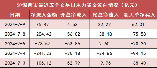 今日沪深两市主力资金开盘净流入4.53亿元,尾盘净流入22.22亿元,全天净流入75.47亿元。