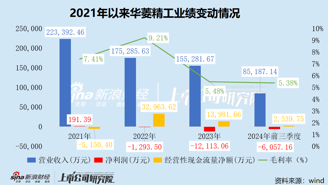 今年前三季度,华菱精工实现营业收入8.52亿元,同比下降25.17%,自2019年以来首次跌破10亿关卡;净亏损继续扩大到6057.16万元,经营现金流较上年同期缩水近六成。