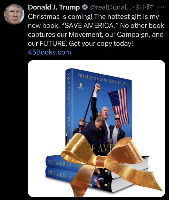 15日,美国当选总统特朗普在社交平台X发文宣传新书《拯救美国(Save America)》,称这是最热门的圣诞节礼物,并介绍称“没有其他的书能描述我们的运动、我们的竞选和我们的未来。”