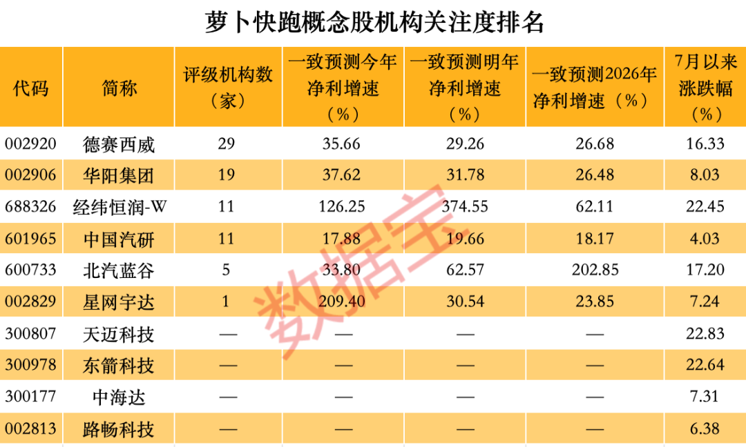 上述概念股未来普遍高成长。根据机构一致预测,11家机构评级的经纬恒润-W2024年至2026年净利增速均值接近188%。另外,北汽蓝谷(600733)、星网宇达、德赛西威(002920)、华阳集团(002906)等个股未来高成长也值得期待。从股价表现来看,上榜个股7月以来集体大涨,天迈科技、东箭科技、经纬恒润-W等个股均涨超20%。