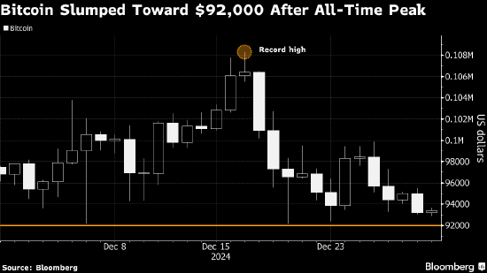 周一伦敦时间05:25,比特币徘徊在93,085美元附近,较12月中旬创下的纪录高点低约15,000美元。以太币、狗狗币等较小的代币同样缺乏动力。