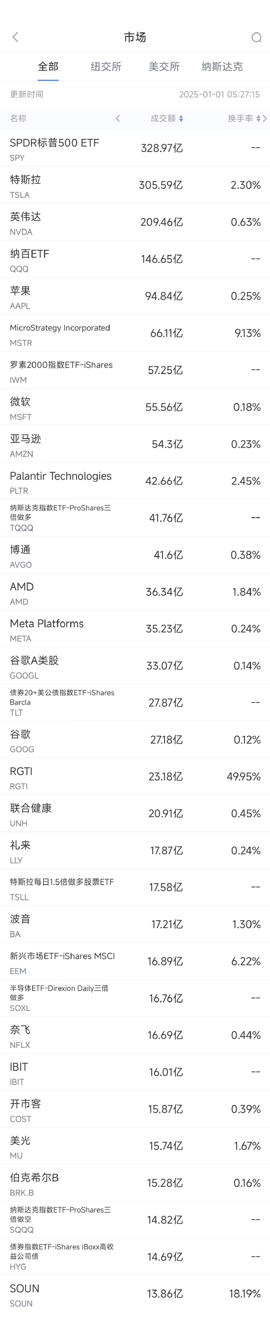周二美股成交额第1名特斯拉收跌3.25%,成交328.97亿美元。特斯拉在2024年上涨超过60%,成为特朗普胜选的一个大赢家。该公司CEO埃隆-马斯克与特朗普的关系密切,且特朗普团队正计划在包括自动驾驶在内的人工智能(AI)领域放松监管。