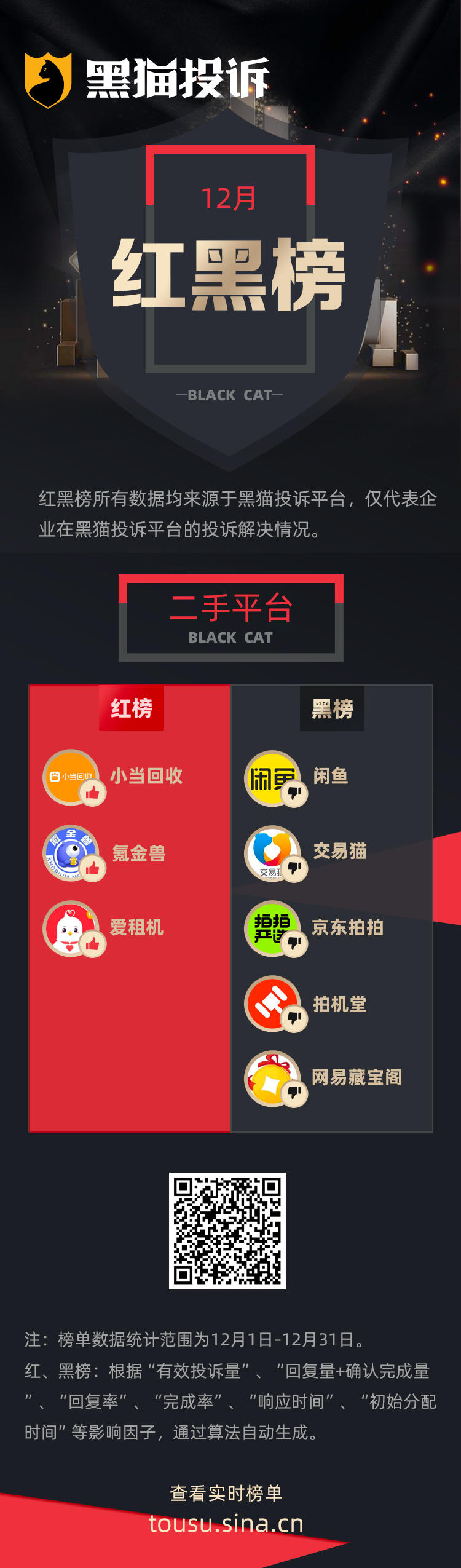 黑猫投诉 【下载黑猫投诉客户端】发布12月企业投诉处理红黑榜单,数据均来源于黑猫投诉平台,反映了企业在黑猫投诉平台的投诉处理解决情况。