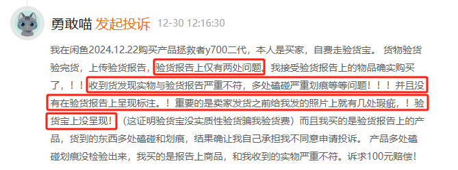 本月,有消费者向黑猫投诉反馈,在闲鱼购买笔记本电脑前,自费走了验货宝,验货报告显示仅有两处问题,于是便下单了,但收到货后发现实物与验货报告严重不符,多处磕碰、严重划痕等问题并没有在报告上标注,更重要的是卖家发货之前发的照片上就有几处瑕疵,报告同样未标注。