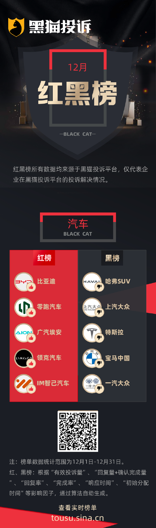 黑猫投诉 【下载黑猫投诉客户端】发布12月企业投诉处理红黑榜单,数据均来源于黑猫投诉平台,反映了企业在黑猫投诉平台的投诉处理解决情况。