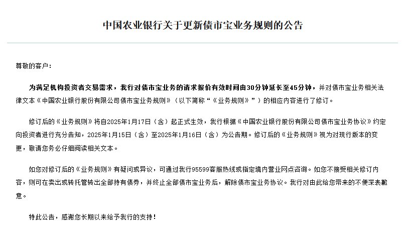 1月15日金融一线消息,中国农业银行今日发布关于更新债市宝业务规则的公告称,为满足机构投资者交易需求,中国农业银行对债市宝业务的请求报价有效时间由30分钟延长至45分钟,并对债市宝业务相关法律文本《中国农业银行股份有限公司债市宝业务规则》(以下简称“《业务规则》”)的相应内容进行了修订。