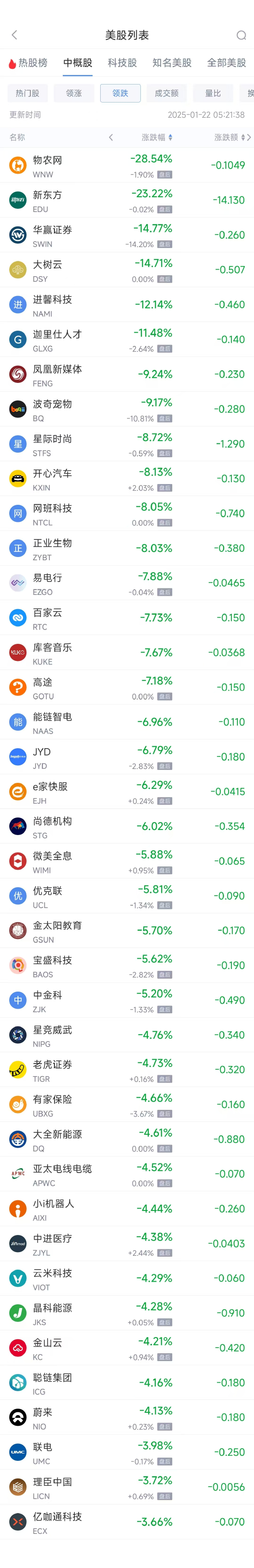 下跌股当中(按市值降序排列),拼多多跌1.35%,京东跌1.28%,贝壳跌1.17%,联电跌3.58%,蔚来跌4.01%,新东方跌23.18%,哔哩哔哩跌2.40%,BOSS直聘跌0.88%,小马智行跌2.64%,万国数据跌2.83%,文远知行跌3.25%,汽车之家跌2.39%。