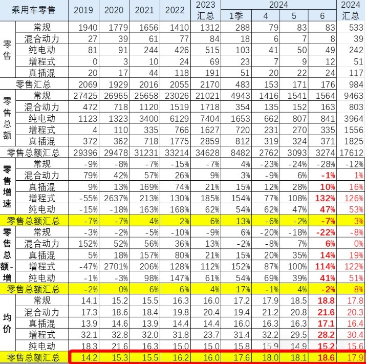 乘联会数据显示,2019年,国内乘用车零售平均价格为14.2万元,2020年为15.3万元,到2023年零售均价提升至16万元。而2024年1~6月,国内乘用车零售均价更攀升至17.9万元,较2019年上涨了3.7万元。