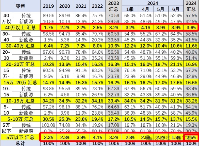 《每日经济新闻》记者查阅乘联会数据发现,从2019年到2024年上半年,国内20万元以上乘用车市场份额持续上升,而10万元以下的中低端乘用车占比却在减少。