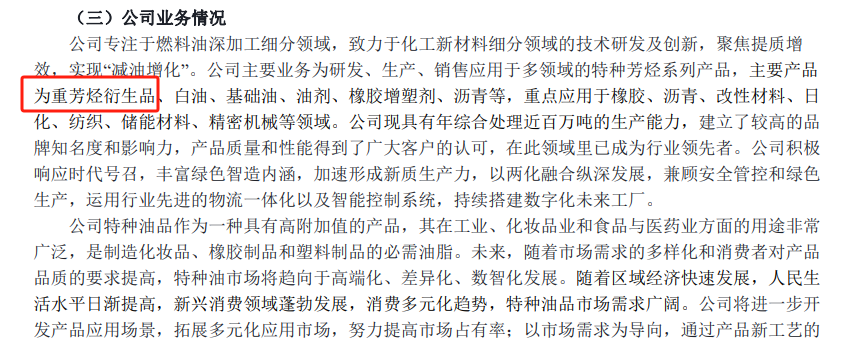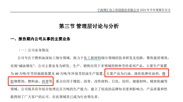 公开资料显示,博汇股份主要业务为研发、生产、销售应用于多领域的特种芳烃系列产品,主要产品为重芳烃衍生品、白油、基础油、油剂、橡胶增塑剂、沥青等,重点应用于橡胶、沥青、改性材料、日化、纺织、储能材料、精密机械等领域。