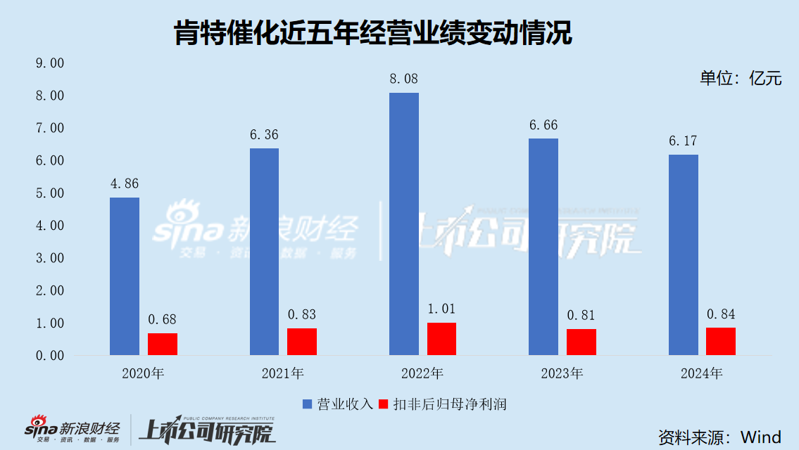 根据立信出具的《审阅报告》,2024年度,肯特催化实现营业收入6.17亿元,较上年下滑7.4%;实现净利润9351.28万元,较上年增长9.75%;实现扣非后归母净利润8416.81万元,较上年增长4.03%,主要系综合毛利率增长所致。
