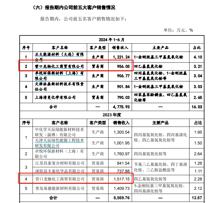 更令人匪夷所思的是,2021年、2022年,龙驰化工又突然从肯特催化的前五大客户名单中消失不见,2023年、2024年1-6月又“梅开二度”,再次成为公司前五大客户,采购金额分别为1517.15万元、956.05万元。