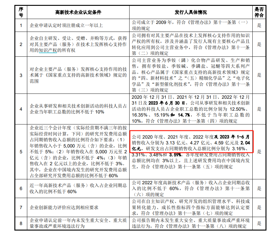 关于对问询函质疑其是否符合高新技术企业标准的回复中,除招股书披露的营收数据较问询函回复披露的销售金额的巨大差异外,肯特催化在问询函回复稿关于“报告期内是否符合高新技术企业认定标准逐项对比”内容中称,“公司2020年度、2021年度、2022年度研发支出占同期销售收入的比例分别为3.16%、3.31%和3.48%”。