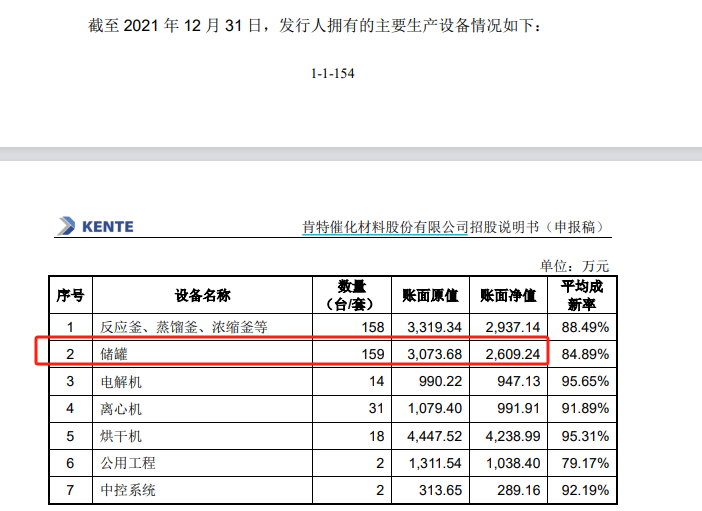 根据肯特催化在2022年5月发布的招股书(申报稿)披露,截止到2021年末公司拥有储罐159台,账面原值为3073.68万元,随后在2023年6月发布的招股书(上会稿)中则披露,截止到2022年末拥有储罐设备149台、合计原值为3085.08万元。
