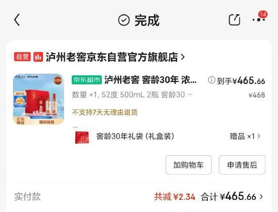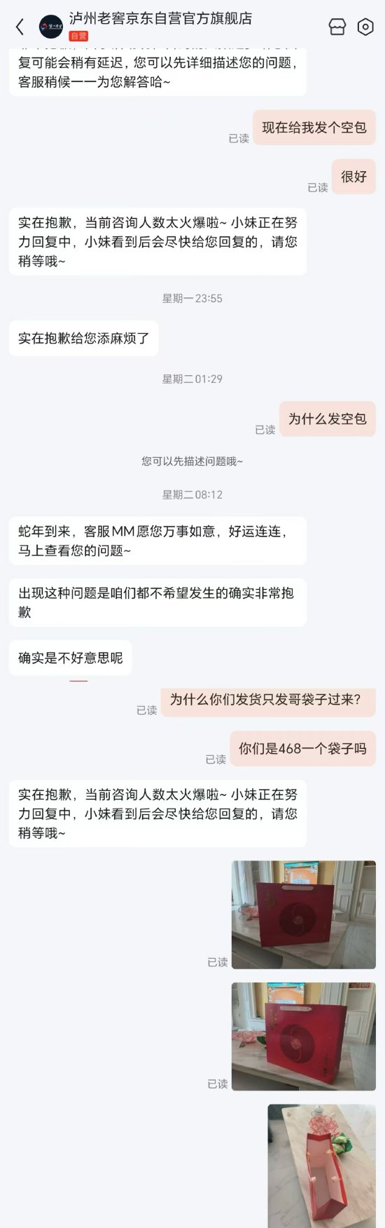 468元买两瓶泸州老窖却只收到空袋子,店铺客服:不好意思