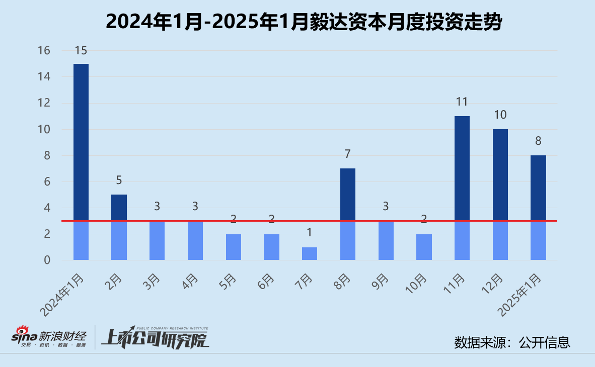 统计区间内,毅达资本公开披露的股权投资事件共8起,与2024年1月和12月相比分别减少33.3%、9.1%。往期数据显示,2024年2-7月,毅达资本的投资节奏都相对低迷,平均每个仅出手1-3次。8月小幅回升后再次走低,直至年底才有起色。