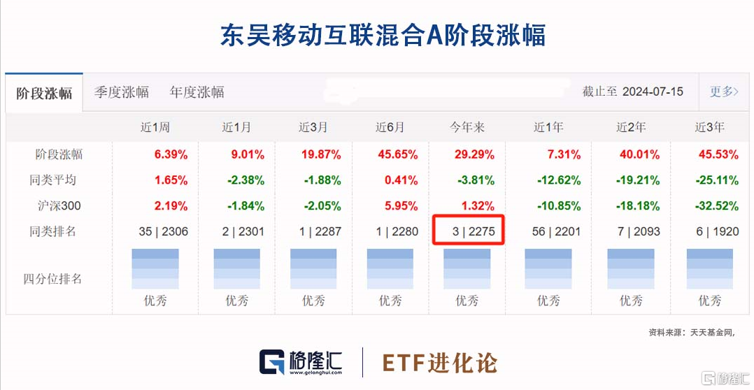 凭借44.9%的收益率获得去年公募基金季军的东吴移动互联网混合基金业绩相对保持稳定,截至7月15日,东吴移动互联网混合基金今年以来收益率29.29%,位居2275只同类基金中第三。