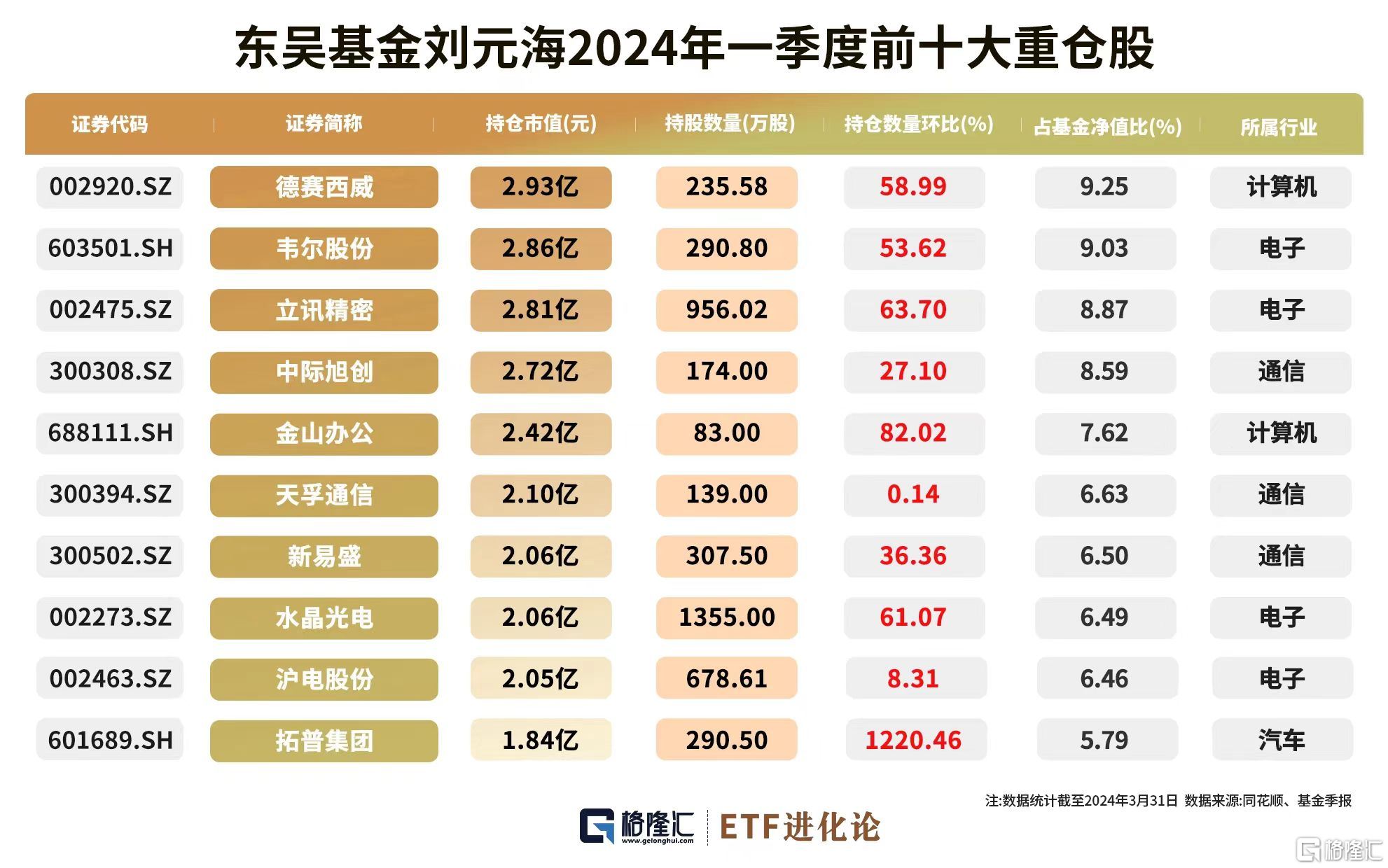 今年一季度,刘元海前十大重仓股包括:德赛西威(002920)、韦尔股份(603501)、立讯精密(002475)、中际旭创(300308)、金山办公、天孚通信(300394)、新易盛(300502)、水晶光电(002273)、沪电股份(002463)、拓普集团(601689)。