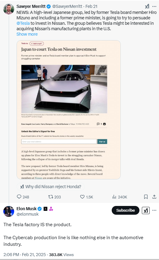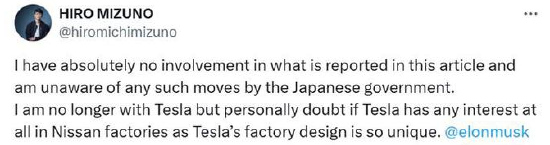 较早时,特斯拉前董事水野弘道已经否认了相关报道,他在X上发帖,否认他与“日本财团起草特斯拉投资日产汽车的计划”有关联,“我也不知道日本政府有任何此类举动”。