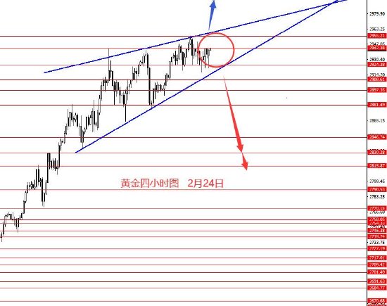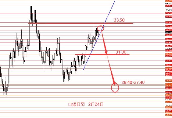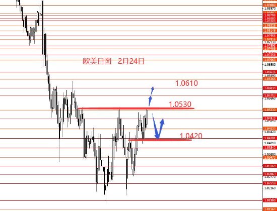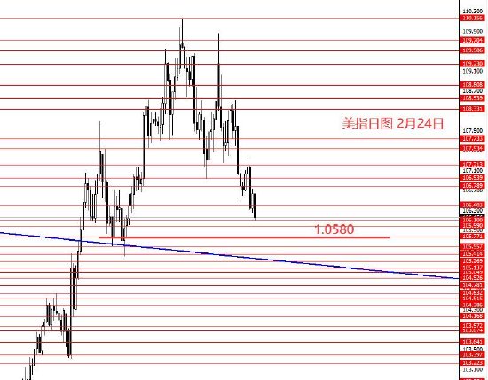 2月24日,上周美指正如预期反弹后继续下行,目标价106.10也已到位。从图形来看,若此区域继续下行,最多也就是105.80附近,也就是本月的鱼尾行情了,所以建议美指空单可以平仓离场了,剩下的行情观望就好。本周最大概率就是105.80上方震荡盘整为主,可操作性不强,短线可以灵活处理,周内没有小波段行情了,观望为主吧,等待月线收盘后再进行下一步计划。