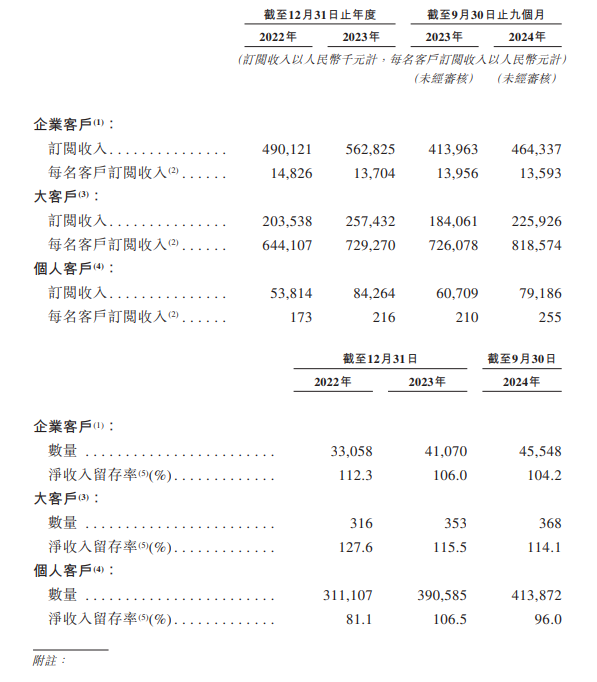 更何况,对于订阅制模式的群核科技而言,客户的留存、付费意愿则是业务关键。但从招股书来看,这些指标表现却难言乐观。一方面,企业客户贡献了群核科技的大部分订阅收入,但与此同时企业客户中每名客户订阅收入却从2022年的1482.6万元降至2023年的1370.4万元,再降至2024年前三季度的1359.3万元,单客户的付费意愿明显下滑。另一方面,来自企业客户、大客户的净收入留存率也均出现下滑,其中企业客户从112.3%下滑至104.2%,大客户则从127.6%下滑至114.1%。