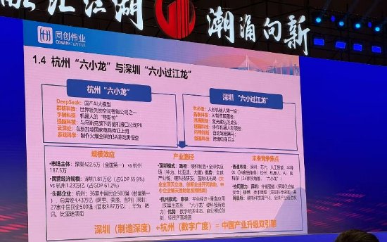 同创伟业创始合伙人郑伟鹤作为签约代表发布演讲,在演讲过程中,郑伟鹤介绍了“杭州六小龙”与“深圳六小过江龙”,从现场PPT中可以看出,包括宇树科技、云深处等为代表的杭州六小龙的规模效应、产业路径等方式。