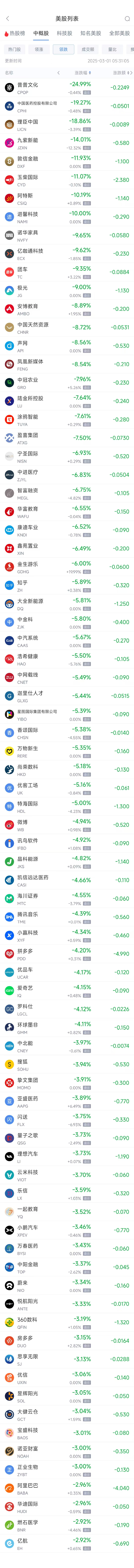 领跌中概股列表: