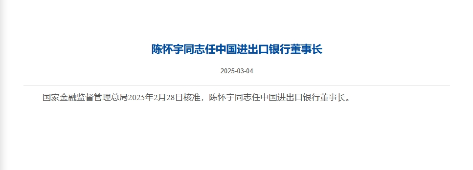 3月5日金融一线消息,据中国进出口银行官网日前公告, 国家金融监督管理总局2025年2月28日核准,陈怀宇同志任中国进出口银行董事长。