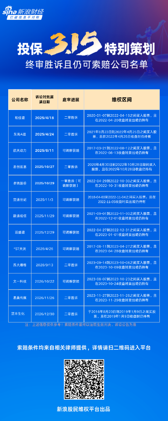 去年以来,多起股民索赔案喜迎终审胜诉,新浪股民维权平台特此整理目前仍在诉讼时效之内且已经二审胜诉或可以调解获赔的公司名单,适格股民需高度关注,积极参与维护自身权益!