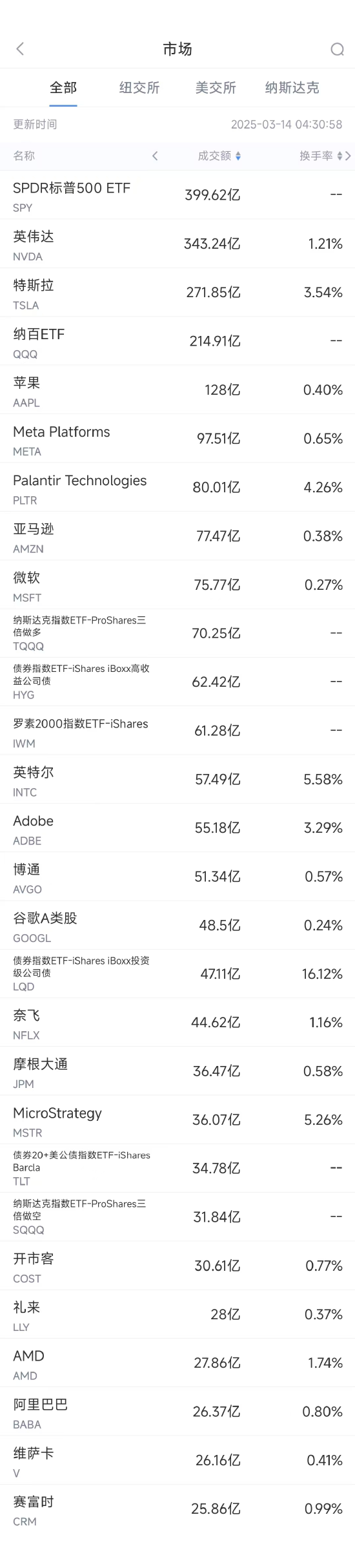 3月13日美股成交额前20:特斯拉称可能成为报复性关税目标