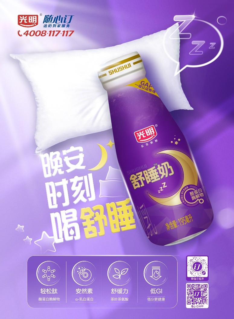 光明乳业舒睡奶系列新品瞄准“睡眠经济”。其中,光明舒睡牛奶甄选GAP一级牧场的优质奶源,采用优于欧盟标准的生牛乳作为原料,并配比多种有助于睡眠的成分;光明优加舒睡奶粉特别添加了全新光明自主知识产权专利菌株——唾液链球菌嗜热亚种BD9818,还添加了传统食材酸枣仁粉和茯苓粉,传统与现代的结合,使光明优加舒睡奶粉成就更舒适的睡眠体验。