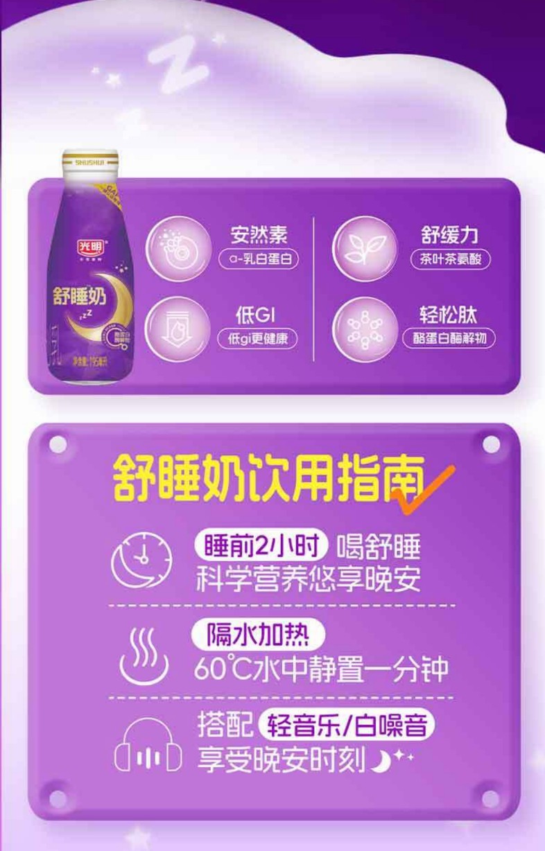科研实验显示,睡前一杯舒睡奶,能舒缓神经、放松身心,让忙碌一天的大脑“慢下来”,从而帮助消费者调整睡眠周期,提升睡眠质量。